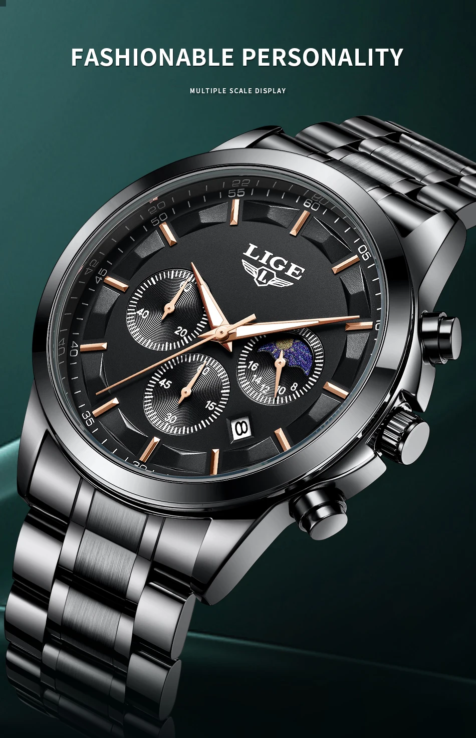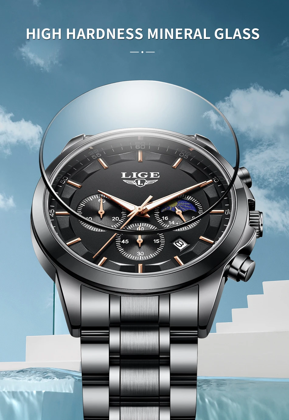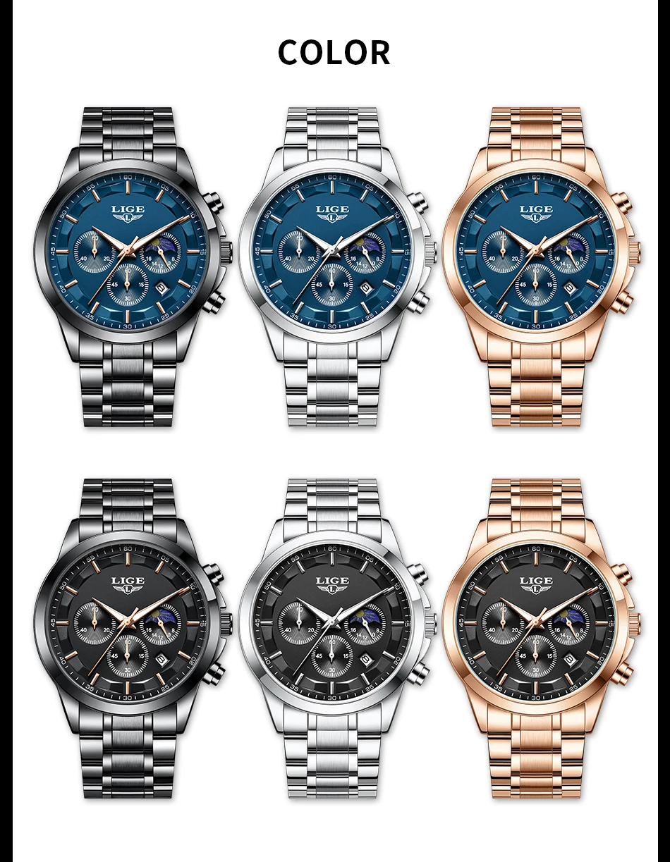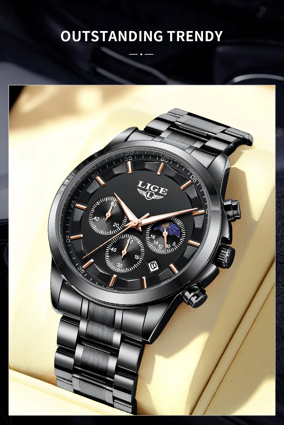 LIGE Top Brand Luxury Quartz Man Watch Classic Fashion Stainless Clock Moon Phase Auto Date Waterproof Watches Male Reloj Hombre