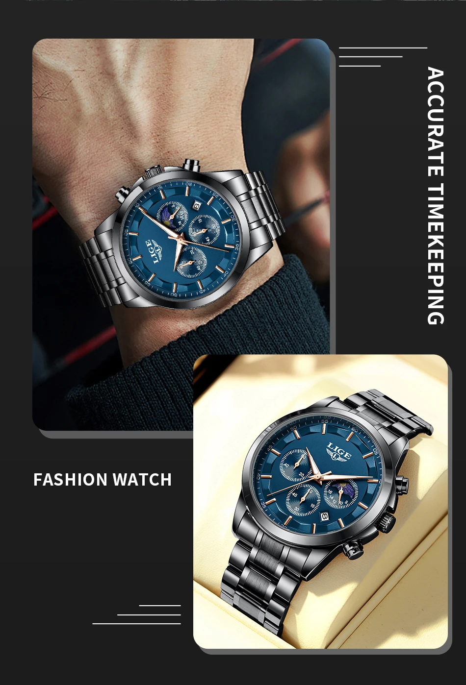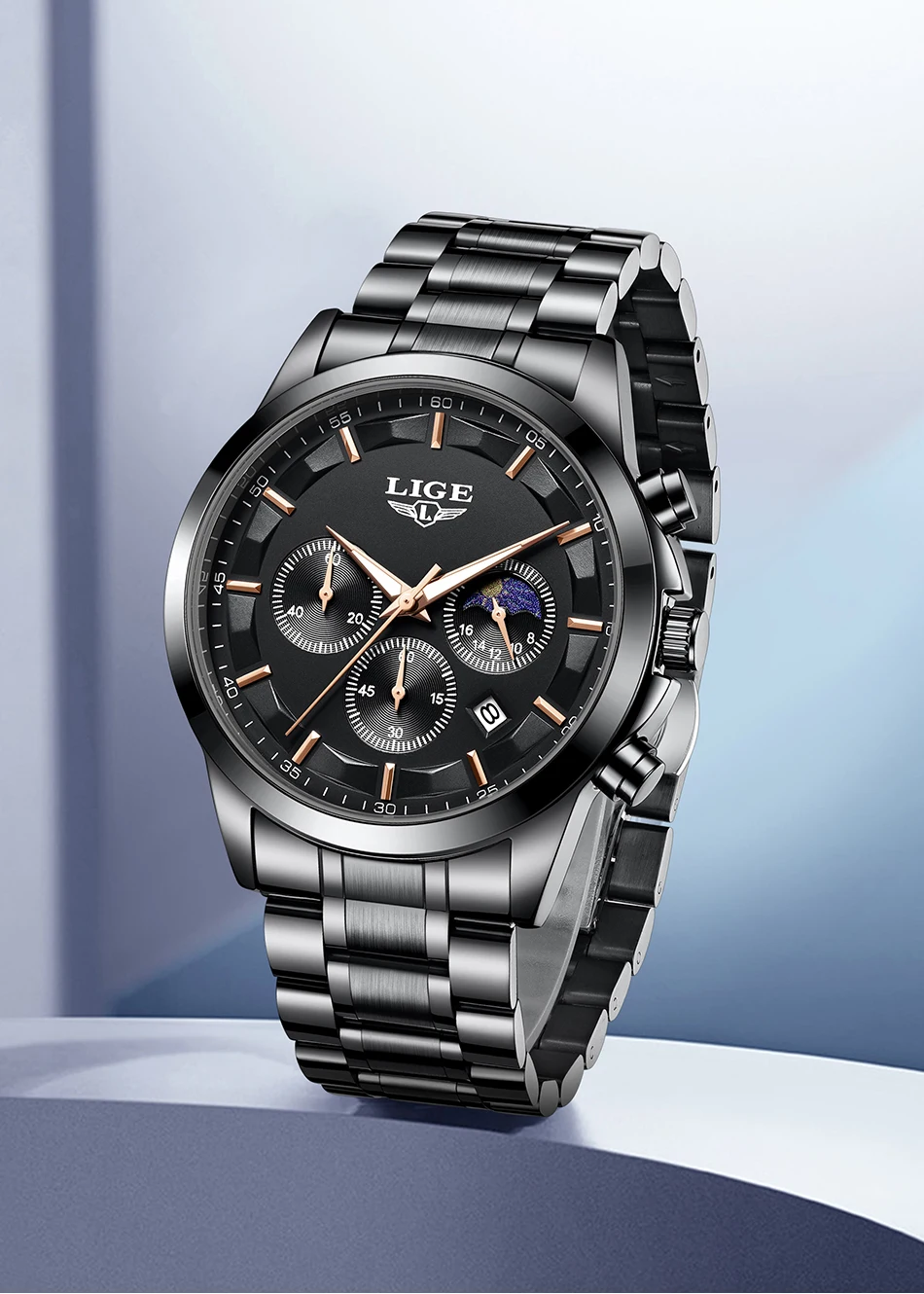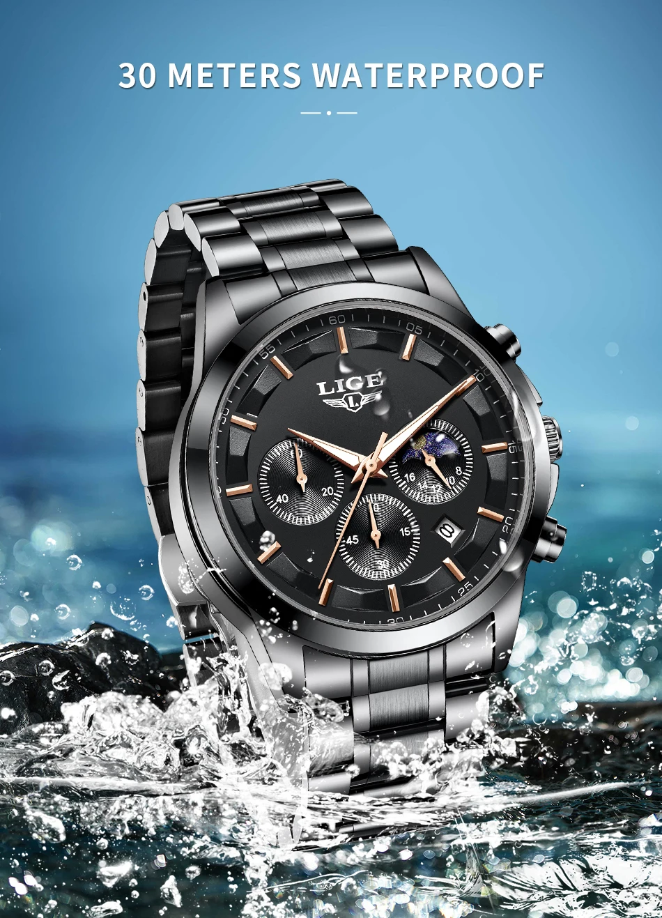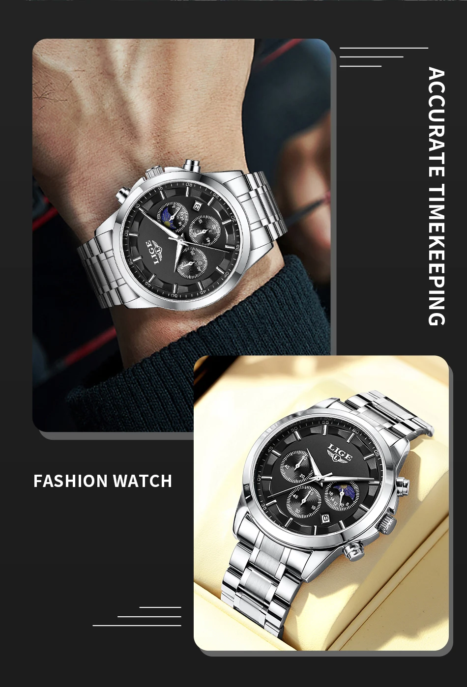 LIGE Top Brand Luxury Quartz Man Watch Classic Fashion Stainless Clock Moon Phase Auto Date Waterproof Watches Male Reloj Hombre