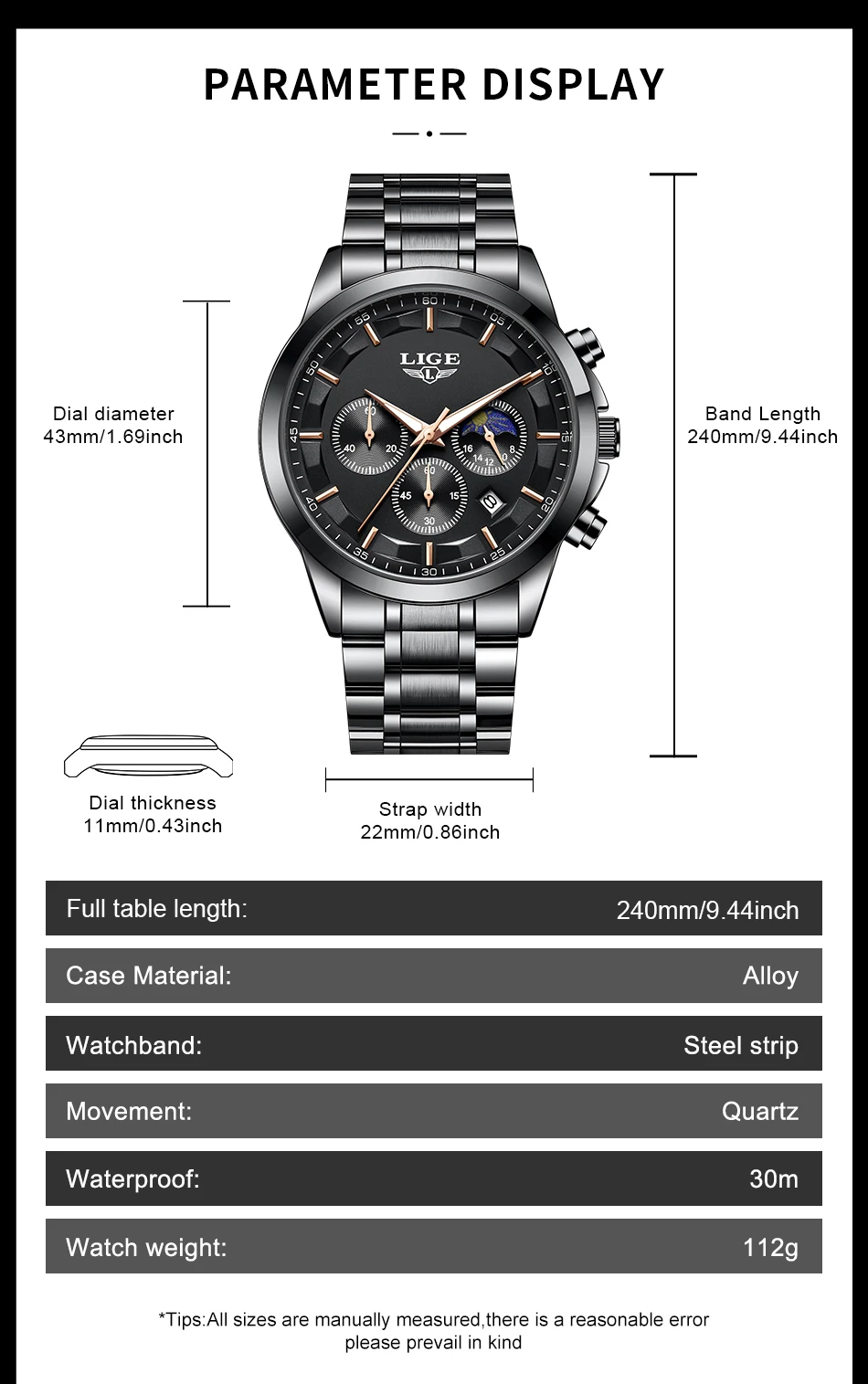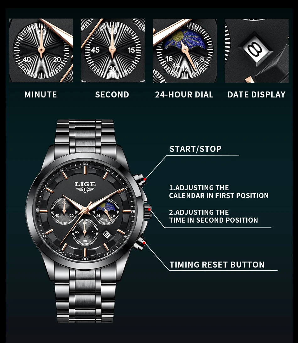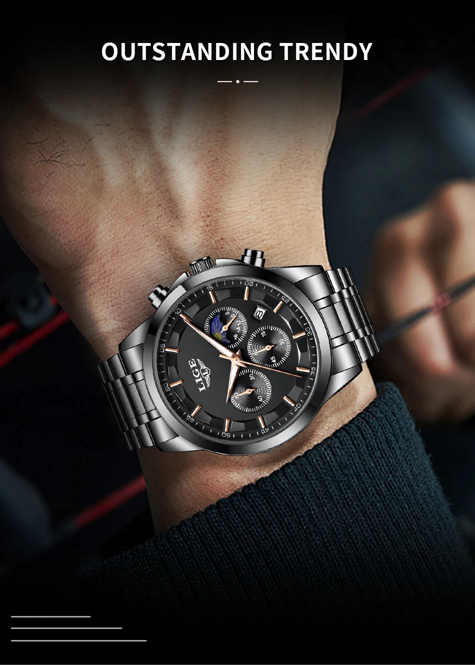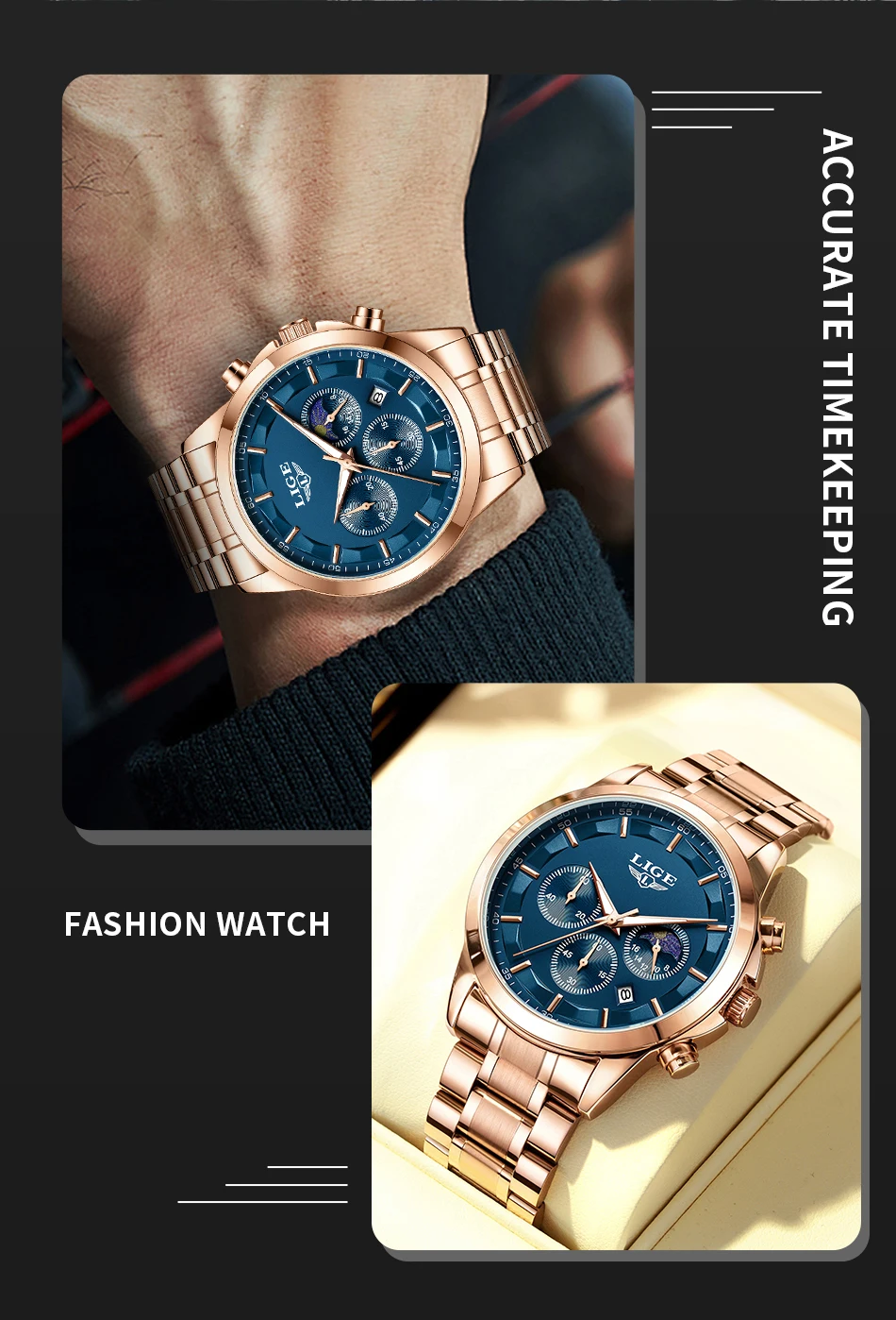 LIGE Top Brand Luxury Quartz Man Watch Classic Fashion Stainless Clock Moon Phase Auto Date Waterproof Watches Male Reloj Hombre